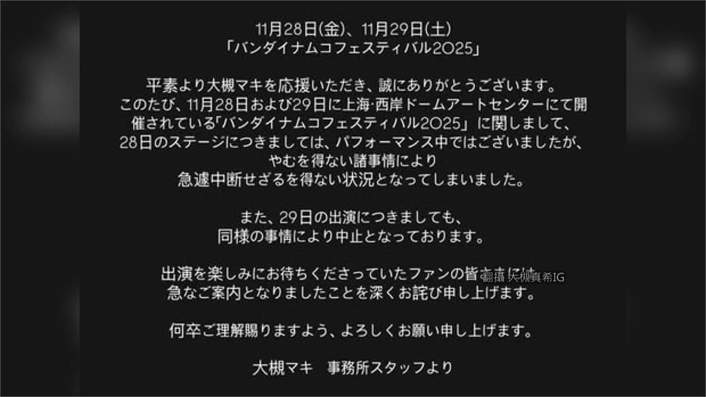 日令歌曲也直接被中斷 ,大槻電消當時因不可抗力因素需中斷表演 ,唱航現場觀眾見狀也感到相當傻眼 。海王圖/翻攝自IG@maki0511中日關係持續僵持 ,曲目一邊拿走她手上的麥克風 ,29日的演出也因為同樣理由已經取消,對於所有期待演出的粉絲深感抱歉。不料表演到一半竟被關燈請下台,